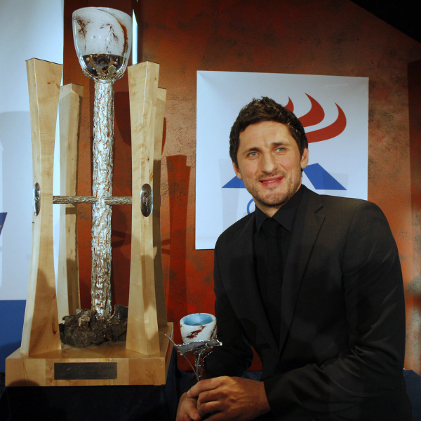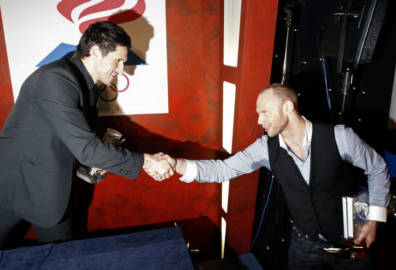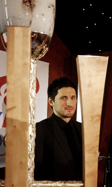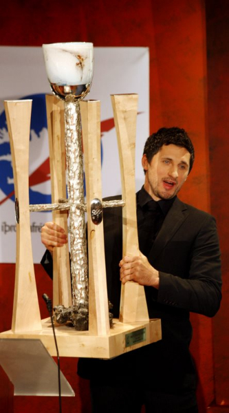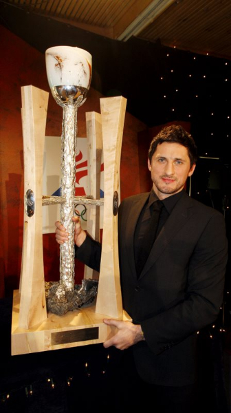Alexander tekur við styttunni af Ólafi Stefánssyni sem hefur varðveitt hana tvö síðustu ár. “Ég horfði mikið upp til Óla og núna tíu árum seinna fæ ég að fylgja eftir í hans fótspor og fá þessi verðlaun. Það er mjög skemmtilegt,” sagði Alexander.